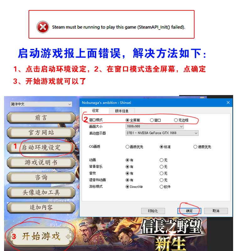 如果运行桌面图标后不能启动游戏,出现英文提示,Steam must be running to play this game (SteamAPI_int() failed )关掉错误提示,你随便切换语言再切回来或者点启动环境设置 在开始游戏