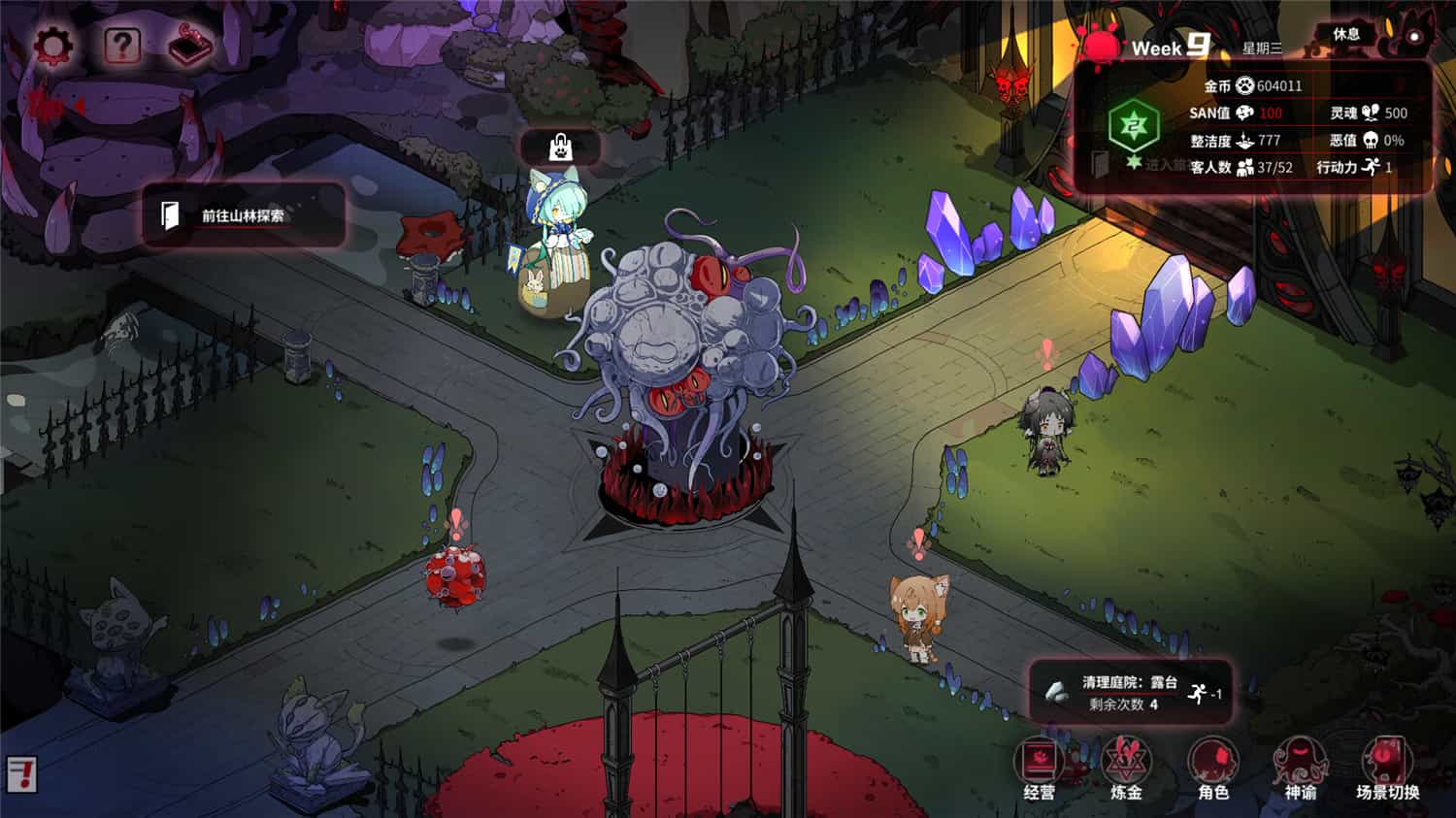 在这款模拟经营+AVG游戏中,你继承一座荒废已久的别墅并欠下黑暗债务。你将招募死神、龙族、斩灵师、人造人等员工开展旅社经营。奇怪的客人将带着神秘事件到访。你会通过挖矿,冒险,炼金,经营餐厅等不同策略积攒资产,不断调整策略,带领旅社走向不同结局,另,员工可攻略。